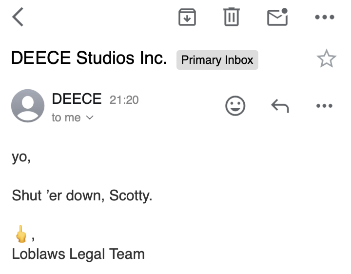 “A re-enactment of how it felt receiving a cease and desist letter from a Loblaws Legal Representative. I’ve closed down my old email since then, so I couldn’t pull up the original.”