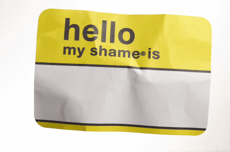 I had another neat idea: flip the classic “Hello, my name is” sticky name tags you’d wear at an office party or during shadow day (at the new school you definitely regret leaving your friends for) into “Hello, my shame is.” Instead of scribbling your name, you’d write your shame and wear it proudly on your sleeve (or, in this case, somewhere vaguely visible on the front of your shirt).